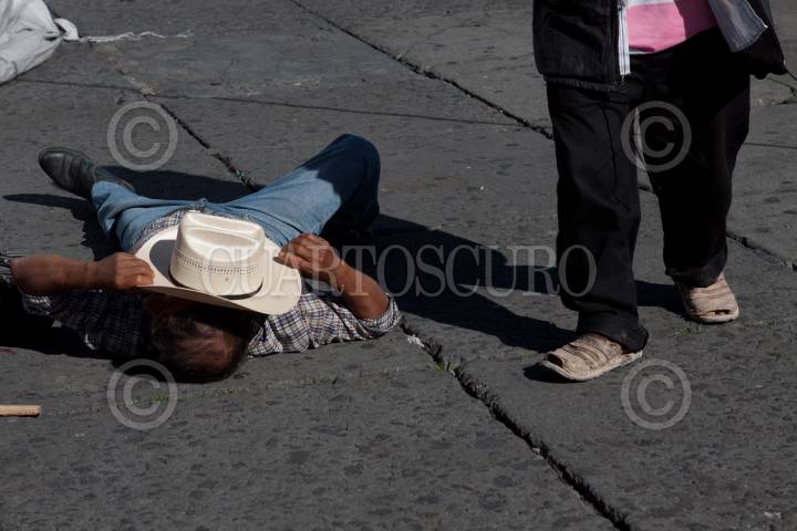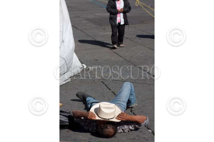 MÉXICO, D.F., 20JULIO2011.- La desocupación en personas de edad productiva es uno de los grandes males de la ciudades. La imagen corresponde a un integrante del Frente Popular Francisco Villa acostado en la plancha del Zócalo. FOTOS: MOISÉS PABLO/CUARTOSCURO.COM