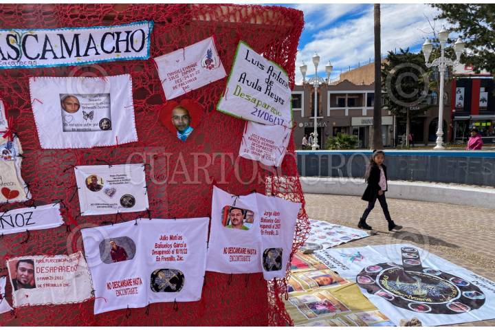 FRESNILLO, ZACATECAS, 11FEBRERO2024.- Colectivos de familiares de desaparecidos en Zacatecas en compañía de Sangre de mi Sangre realizaron una actividad de tejido en el Jardín Obelisco en el centro histórico del municipio. Además de tejer la representación simbólica de las miles de víctimas en el país, las madres arreglaron el árbol de la memoria que se mantiene en el mismo espacio. FOTO: ADOLFO VLADIMIR /CUARTOSCURO.COM