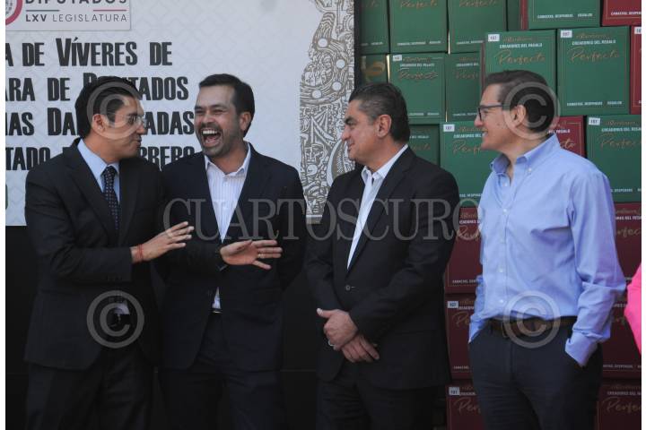 CIUDAD DE MÉXICO, 07NOVIEMBRE2023. - Jorge Romero, presidente de la Jucopo, dialoga con Jorge Álvarez Maynez y Luis Chazaro, durante el evento del envío de víveres a Acapulco tras el pasó del huracán Otis. FOTO: DANIEL AUGUSTO /CUARTOSCURO.COM