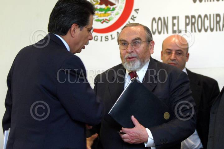 México, D.F. 22 ABRIL 2004.- El senador Jesús Ortega (PRD) se despide del Bernardo Bátiz, procurador de justicia del DF, al termino de su comparecencia ante la comisión del Distrito Federal. Al fondo Renato sales, subprocurador de investigaciones previas. FOTO: Sandra Perdomo/CUARTOSCURO.COM