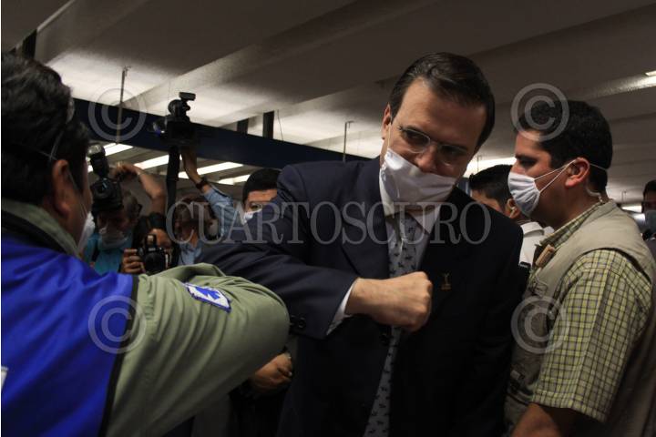 MÉXICO D.F., 02 MAYO2009.- Marcelo Ebrard jefe de gobierno del Distrito Federal pone en marcha el programa de limpieza profunda en el Sistema de Transporte Colectivo Metro para contener la influenza humana, en la imagen el mandatario capitalino se despide del personal medico que estara ubicado en las estaciones del metro FOTO: SÁSHENKA GUTIÉRREZ/CUARTOSCURO.COM
