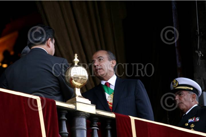 MÉXICO, D.F.16SEPTIEMBRE2009.- Carlos Navarrete, presidente del Senado de la República se despide del presidente Felipe Calderón al termino del Desfile Militar por el 199 aniversario del inicio de la lucha de Independencia que salio del Zócalo de la Ciudad de México hasta la Glorieta de la Diana Cazadora. FOTO: RODOLFO ANGULO/CUARTOSCURO.COM