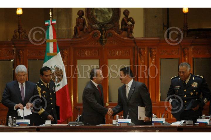 MÉXICO, D.F., 26NOVIEMBRE2009.- El presidente Felipe Calderón se despide de Carlos Navarrete, presdiente de la mesa directiva de la Cámara de Senadores al termino de la XXVII Sesión del Consejo Nacional de Seguridad Pública que se realizo en el Salón Tesorería de Palacio Nacional. FOTO: RODOLFO ANGULO/CUARTOSCURO.COM