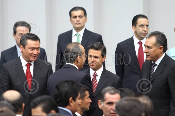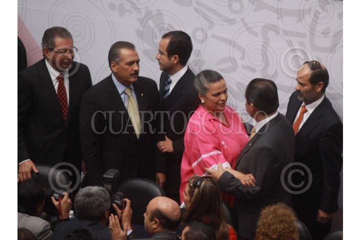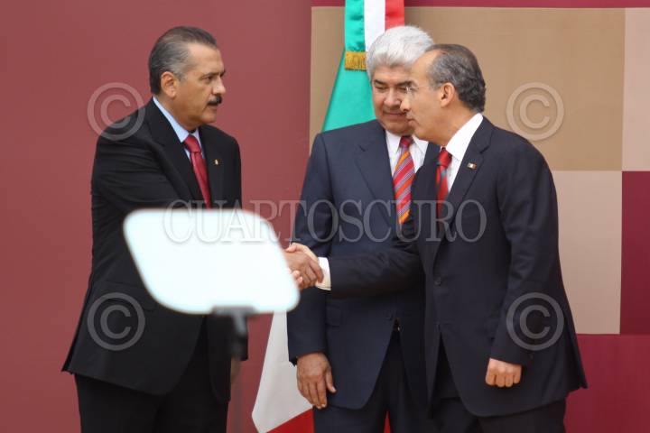 MÉXICO, D.F., 02SEPTIEMBRE2010.- El presidente Felipe Calderón se despide del senador Manlio Fabio Beltrones, presidente de la mesa directiva de la Cámara de Senadores y del diputado Francisco Ramírez Acuña, presidente de la mesa directiva de la Cámara de Diputados al termino del mensaje presidencial por motivo del 4to Informe de Gobierno que se realizo en el patio de Palacio Nacional. FOTO: RODOLFO ANGULO/CUARTOSCURO.COM