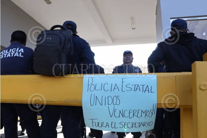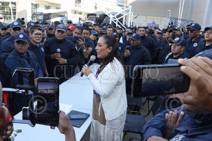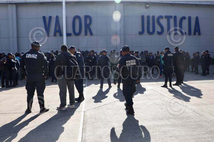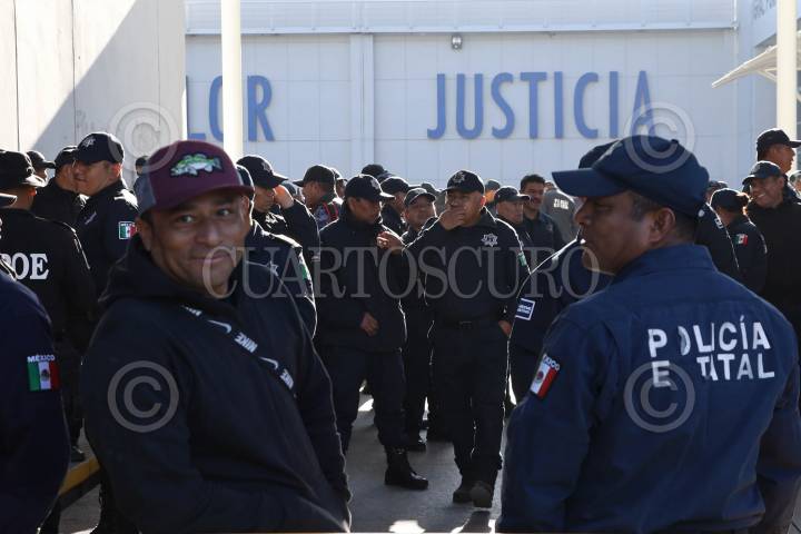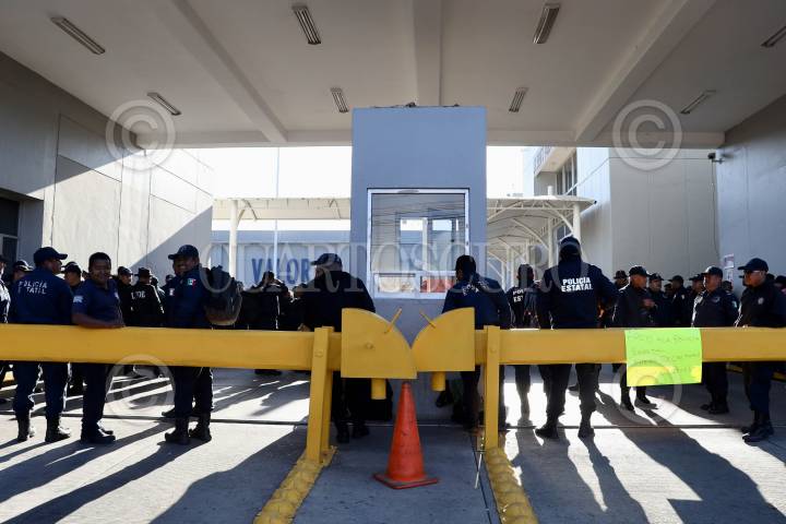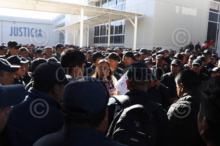 SANTA MARÍA COYOTEPEC, OAXACA, 26FEBRERO2025.- Este miércoles desde temprana hora policías estatales de Oaxaca iniciaron una manifestación al interior del cuartel de la corporación para acusar la intención de despido de más de 400 elementos por no haber aprobado los exámenes de control y confianza (C3). La titular del Secretariado Ejecutivo del Sistema Estatal de Seguridad Pública, Karina Barón Ortiz arribó al cuartel para dialogar con los elementos y aclarar la situación. Los manifestantes pidieron que se hicieran nuevos documentos en donde conste que no serán despedidos y no habrá represalias en su contra. FOTO: CAROLINA JIMÉNEZ/CUARTOSCURO.COM
