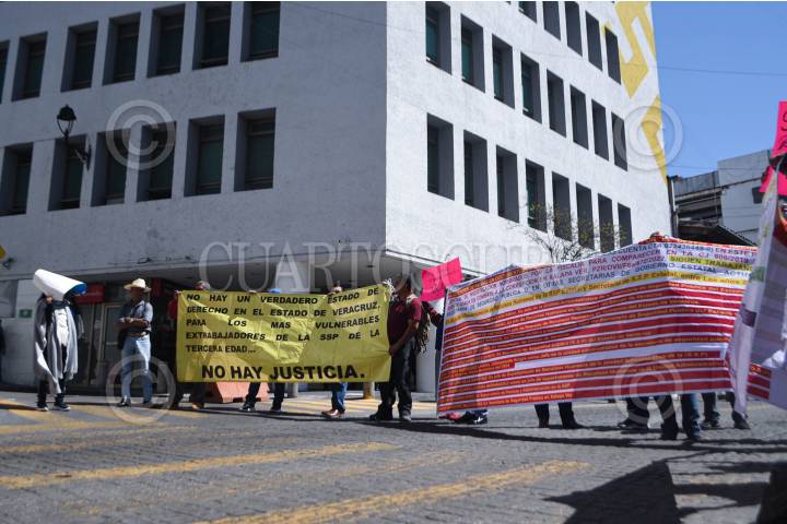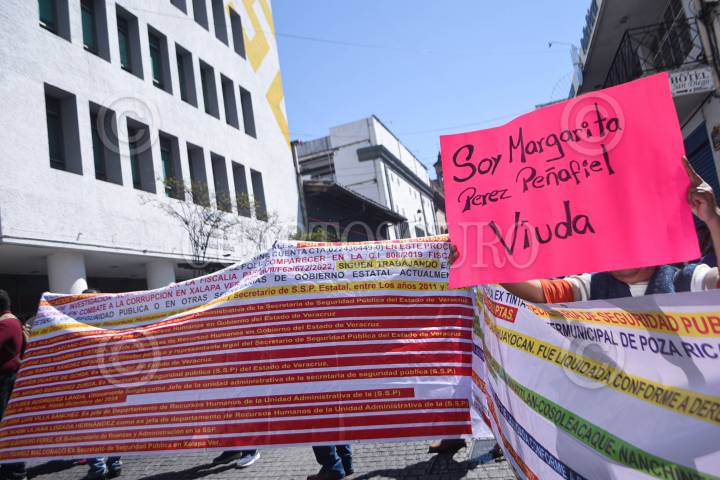 XALAPA, VERACRUZ, 26FEBRERO2025.- Ex policías de la extinta Policía Intermunicipal Poza Rica- Tihuatlán- Coatzintla cerraron por unas horas el centro de Xalapa en protesta porque la Secretaría de Seguridad Pública no han pagado los adeudos salariales que tienen con ellos. Los inconforme pidieron la intervención de la gobernadora Rocío Nahle. FOTO: YERANIA ROLÓN/CUARTOSCURO.COM