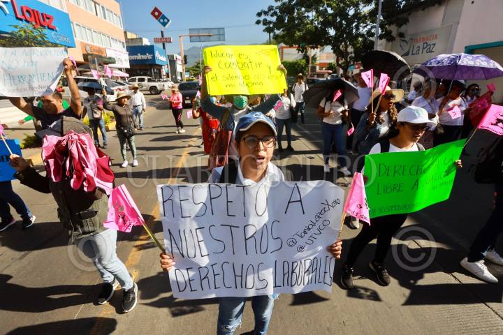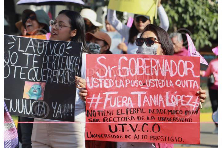 OAXACA, OAXACA, 21SEPTIEMBRE2023.- Estudiantes y trabajadores despedidos de la Universidad Tecnológica de los Valles Centrales de Oaxaca (UTVCO) marcharon en la capital de Oaxaca para exigir la reincorporación de 14 trabajadores docentes y administrativos que fueron despedidos. El conflicto se originó cuando trabajadores conformaron un sindicato, tras lo cual vino el despido y este hecho ha retraso el inicio de las actividades en la institución educativa. Los manifestantes afirmaron además qué hay 51 profesores a quienes no se les han asignado horas clase. El conflicto afecta a más de 1500 alumnos. FOTO: CAROLINA JIMÉNEZ/CUARTOSCURO.COM
