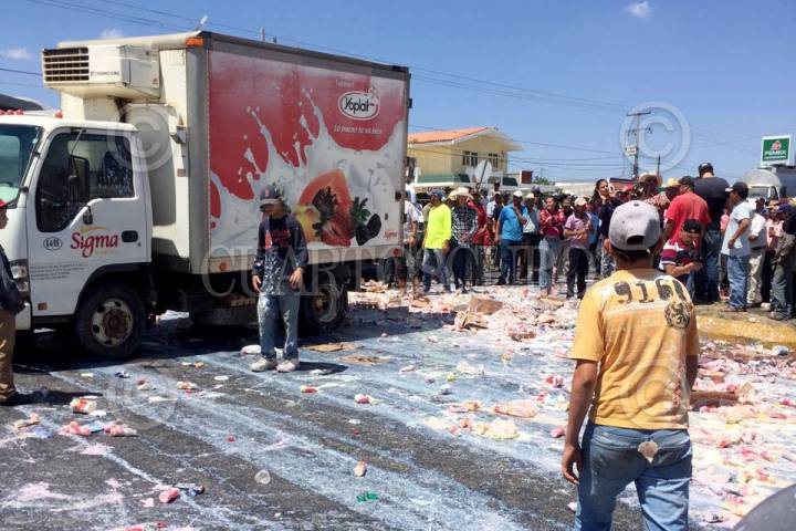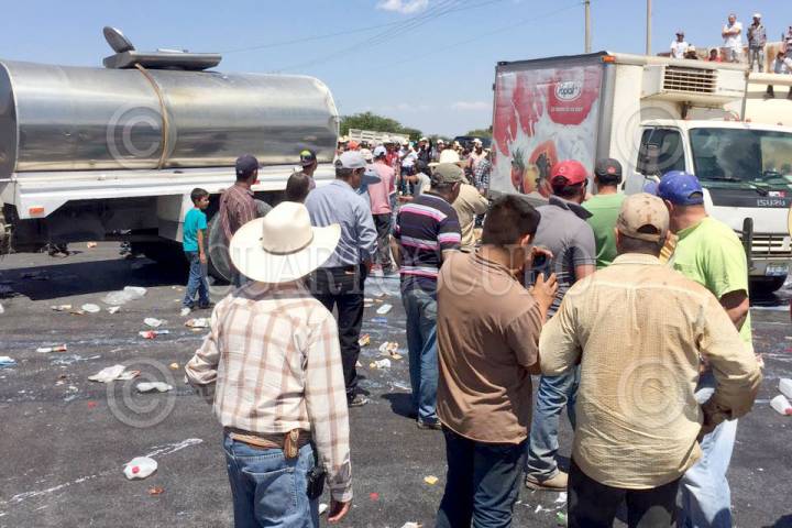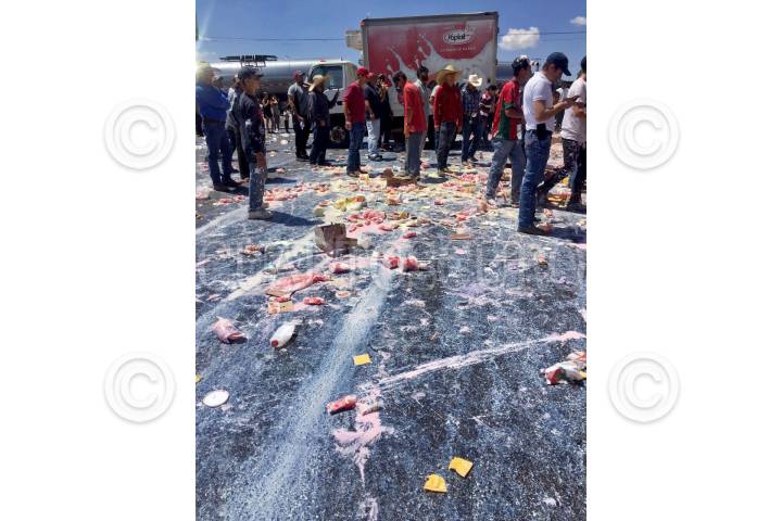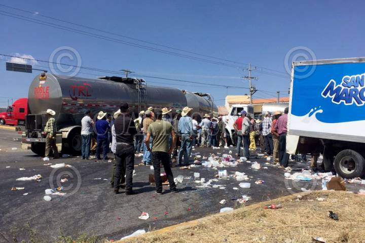 SAN MIGUEL EL ALTO, JALISCO, 21ABRIL2016.-Productores lecheros de la zona Altos del estado realizaron diversos bloqueos carreteros, los productores de leche piden un precio justo y que no existan topes de compra y para realizar presión realizaron dichos cierres de circulación y a los transportistas de mercancía de lácteos que pasaban por el lugar fueron despojados del producto para después tirarlo. FOTO : CUARTOSCURO.COM