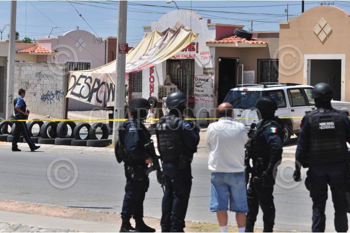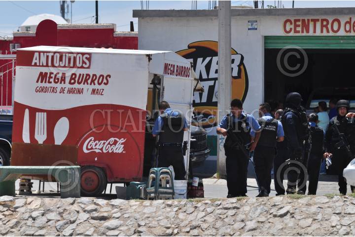 CIUDAD JUAREZ, CHIHUAHUA, 15MARZO2012.- Tres hombres fueron ejecutados por gatilleros la mañana de este jueves a la entrada de una desponchadora, en el fraccionamiento Parajes de Oriente. Las víctimas, dos empleados y un vecino, fueron atacados por el comando armado a las 10:30 horas, mientras platicaban en la banqueta de ese negocio ubicado sobre calle Custodios de la República. Dos individuos bajaron de un automóvil color negro y vaciaron armas de forma directa contra el grupo, para huir de inmediato, según habitantes del sector. FOTO: NACHO RUIZ/CUARTOSCURO.COM