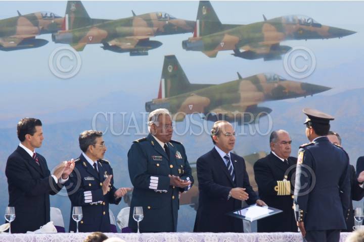 SANTA LUCÍA, EDO. DE MEX., 10FEBRERO2009.- Felipe Calderon Hinojosa encabezó esta mañana la ceremonia conmemorativa del Día de la Fuerza Aérea Mexicana en donde el mandatario entregó condecoraciones y menciones honoríficas a elementos destacados FOTO: SÁSHENKA GUTIÉRREZ/CUARTOSCURO.COM