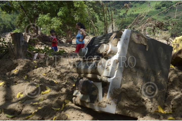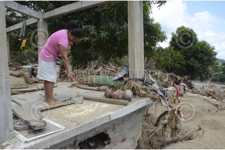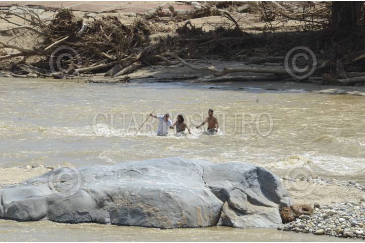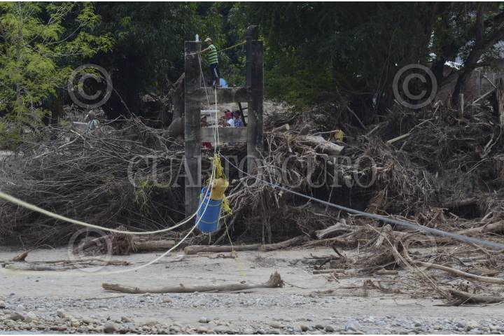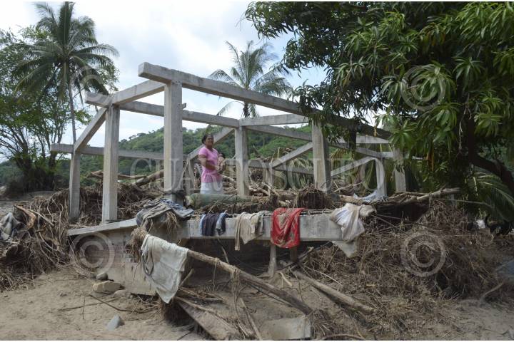 SIERRA DE COYUCA DE BENÍTEZ, GUERRERO, 03OCTUBRE2013.-La mitad de las modestas casas que tenía Barrio Nuevo La Laja, una pequeña comunidad enclavada en la sierra de Coyuca de Benítez, desapareció tras el paso de la tormenta Manuel por las costas guerrerenses. Lo que eran huertas y pastizales que servían para el sustento de sus pobladores ahora son parte del lecho del río Coyuca que amplió su caudal por la fuerza de la corriente que arrasó con todo. Todavía 17 días después de culminadas las torrenciales lluvias permanecen incomunicados, solamente atraviesan las corrientes del río en una tirolesa sujeta de lado a lado mediante un cable de acero al que amarraron de forma improvisada a un tambo y que jalan con mecate para atravesar e ir por víveres. Las familias que perdieron sus viviendas viven refugiados en la escuela primaria del poblado que salvó de las inundaciones junto con la iglesia que se encuentran en la parte más alta. Ambos sitios albergaron a las 140 familias que habitan en Barrio Nuevo La Laja durante el paso de Manuel. Aislado en todo este lapso, apenas recibieron despensas en un helicóptero que aterrizó en el playón más grande que dejo el río, cerca de su comunidad, y de ahí, el cómico Javier Carranza El Costeño llegó junto con Erasmo Catarino llegaron hasta ahí para distribuir víveres. No obstante, sus pobladores que perdieron sus pertenencias duermen en el piso, y demandan el apoyo de cobertores y colchonetas. FOTO: BERNANDINO HERNÁNDEZ /CUARTOSCUOR.COM