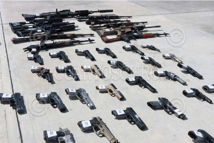 Elementos de seguridad revisan las armas entregadas esta mañana.