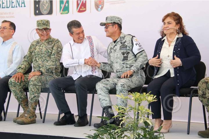 EL SABINO, CHIAPAS, 05JULIO2024.- Román Villalvazo Barrios, comandante de la 31ª Zona Militar; Rutilio Escandón, gobernador de Chiapas, y José Lara Ceballos, comandante del 20 Batallón de la Guardia Nacional en Chiapas, durante la ceremonia de destrucción de armamento y sus accesorios. FOTO: ESPECIAL/CUARTOSCURO.COM