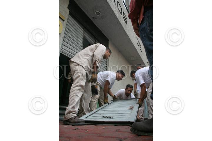 MÈXICO, D.F., 15AGOSTO2008.- Despues que a las cuatro de la mañana, un grupo de 40 personas entrara por la fuerza al edificio del Sindicato de Trabajadores Petroleros, varios equipos de mantenimiento, reparan la puerta que fue destruida. FOTO: ENRIQUE ORDÒÑEZ/CUARTOSCURO.COM