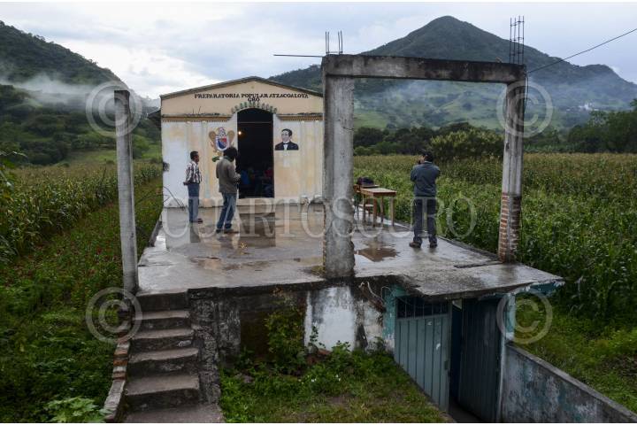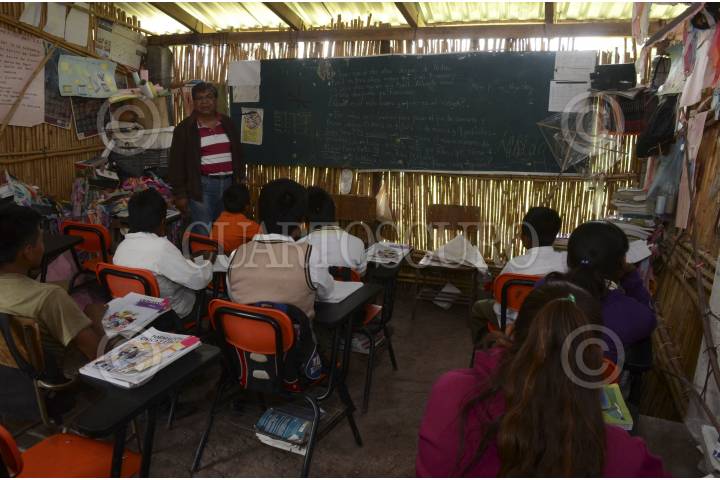 ATZACUALOYA, GUERRERO, 02OCTUBRE2014.- Los 87 estudiantes de la preparatoria popular Benito Juárez, ubicada en la carretera principal de la comunidad indígena de Atzacualoya, toman clases en cuartos prestados que formaban parte de lo que era una capilla. Pese a que la preparatoria sigue los planes y programas de estudios de las preparatorias de la Universidad Autónoma de Guerrero (UAGro) y depende administrativamente de ella, no recibe ningún recurso. Los gastos los cubren los padres de familias que mes a mes aportan $200 para que sus hijos reciban clases. Esta preparatoria popular desde hace cinco años busca que la Secretaría de Educación Pública le otorgue una matrícula, pero según los profesores, la nueva reforma educativa propuesta por el gobierno del priísta Enrique Peña Nieto complica mucho más los trámites, ya que ponen demasiadas clausulas que entorpecen el proceso. FOTO: BERNANDINO HERNÁNDEZ /CUARTOSCURO.COM