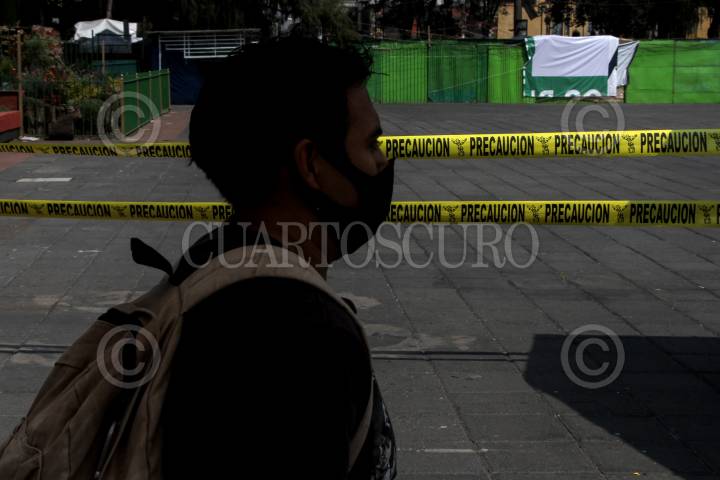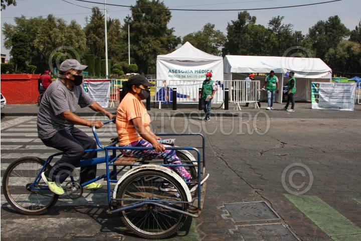 Una pareja en triciclo pasa frente al Kiosco COVID-19 en la alcaldía Xochimilco. FOTO: ROGELIO MORALES /CUARTOSCURO.COM