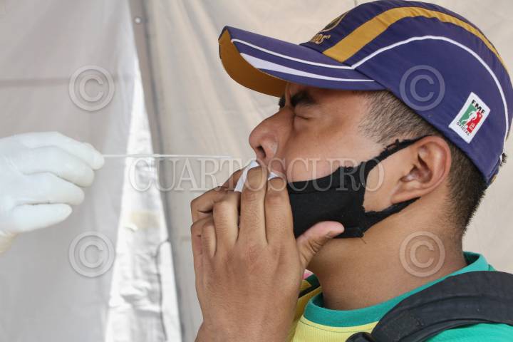 Hombre hace gestos momentos antes de que se realice la toma de muestra nasal para la detección de COVID-19 en el kiosco de la salud de Xochimilco. FOTO: ROGELIO MORALES /CUARTOSCURO.COM