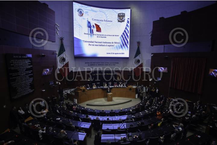 CIUDAD DE MÉXICO, 22AGOSTO2024.- Ceremonia Solemne de la develación de la inscripción en el Muro de honor de la leyenda “Universidad Nacional Autónoma de México. Por mi raza hablará el espíritu” que se llevó a cabo en el pleno de la Cámara de Senadores. FOTO: ANDREA MURCIA /CUARTOSCURO.COM