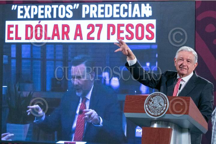 CIUDAD DE MÉXICO, 09SEPTIEMBRE2024.- Andrés Manuel López Obrador, Presidente de México, mostró un vídeo titulado "Expertos predecían el dólar a 27 pesos", en el que vaticinaba una devaluación del peso al inicio de su sexenio, durante la mañanera. FOTO: MOISÉS PABLO/CUARTOSCURO.COM