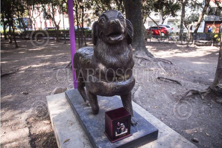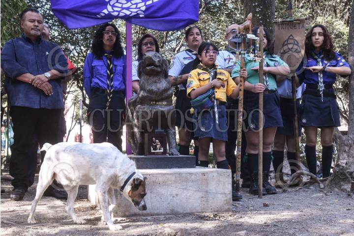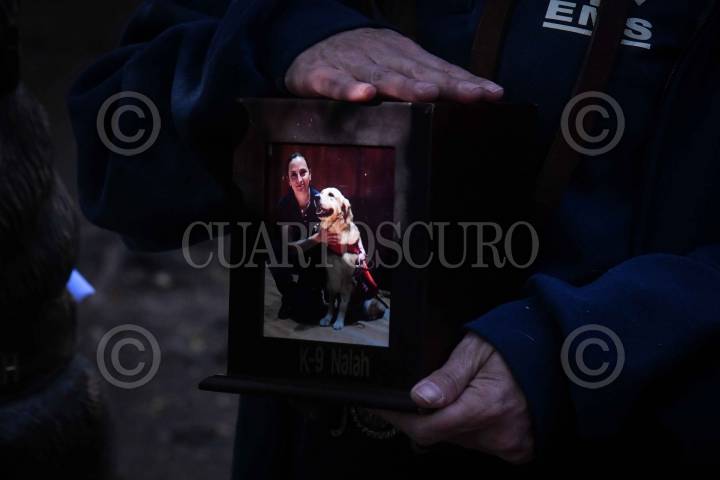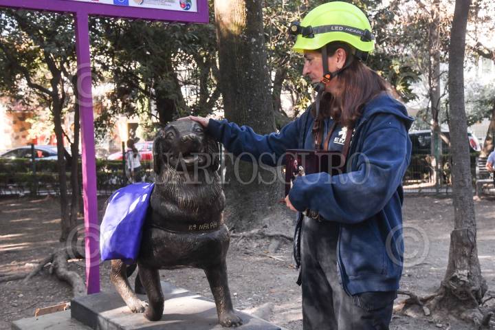 CIUDAD DE MÉXICO, 23NOVIEMBRE2024.- Homenaje y develación de la escultura de "Nalah" (2011-2022) quien fue entrenada como "K9" en búsqueda y rescate, y ayudó en la localización de 17 personas en el sismo del 2017. La escultura se encuentra el área canina del Jardín Santiago Xicoténcatl. FOTO: MARIO JASSO/CUARTOSCURO.COM