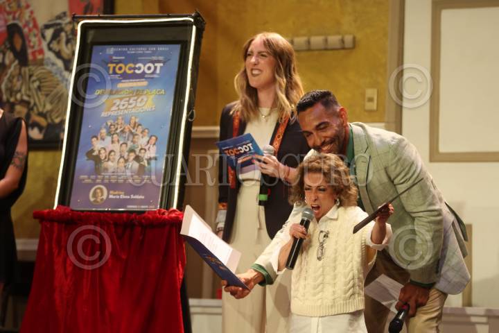 CIUDAD DE MÉXICO, 02MAYO2025. La obra de teatro TOC TOC celebra sus 2650 con una placa en el Centro Cultural San Ángel. MarÍa Elena Saldaña conocida como "La Güereja" asistió como madrina a la develación de placa de la Puesta en escena. FOTO: EDGAR NEGRETE LIRA/CUARTOSCURO.COM