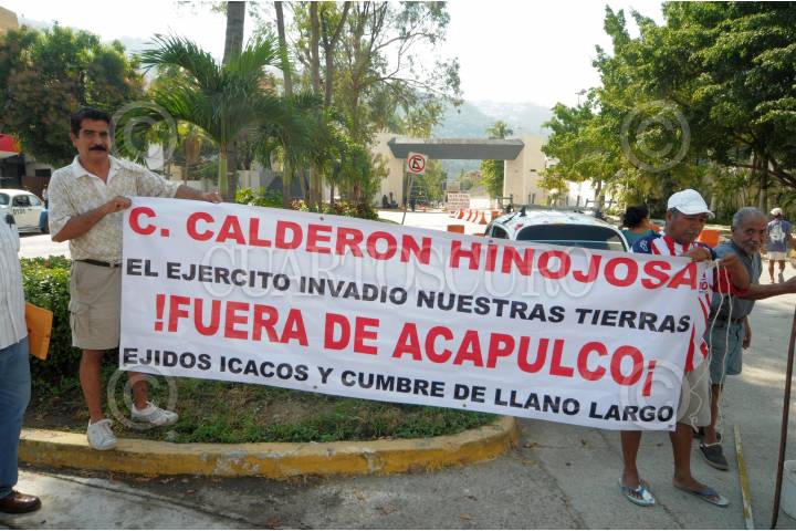 ACAPULCO, GUERRERO, 13DICIEMBRE2010.- Un grupo de personas, protestó a las afueras del recinto militar de esta ciudad, para exigir al presidente Felipe Calderón la destitución del general Guillermo Galván Galván, a quien acusan presuntamente de orquestar el despojo de sus tierras de los ejidos Icacos y Cumbre del llano largo. FOTO: JORGE ALBERTO HERNANDEZ/CUARTOSCURO.COM