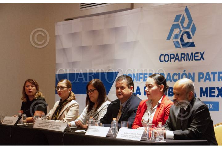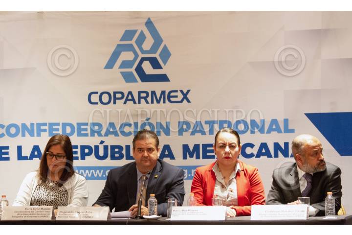 CIUDAD DE MÉXICO, 13AGOSTO2019.- Yubani Ramírez, representante del Colegio Nacional de Abogados de México; Graciela Pompa, representante de la Academia Mexicana de Derecho Fiscal; Karla Ortiz, coordinadora del Comité Fiscal de la Asociación de Abogados de Empresas, Ronaldo Esquer, presidente de la Concisión Nacional Fiscal de COPARMEX; Guillermo Rosales, representante de la Asociasiin Mexicana de Distribuidores de Autos y Mónica Ruiz, representante de la Asociación Mexicana de la Industria Automotriz, durante la conferencia en donde se abordó el tema de la lentitud en devolución de saldos a favor de contribuyentes en el Hotel Hyatt Regency México. FOTO: ROGELIO MORALES /CUARTOSCURO.COM