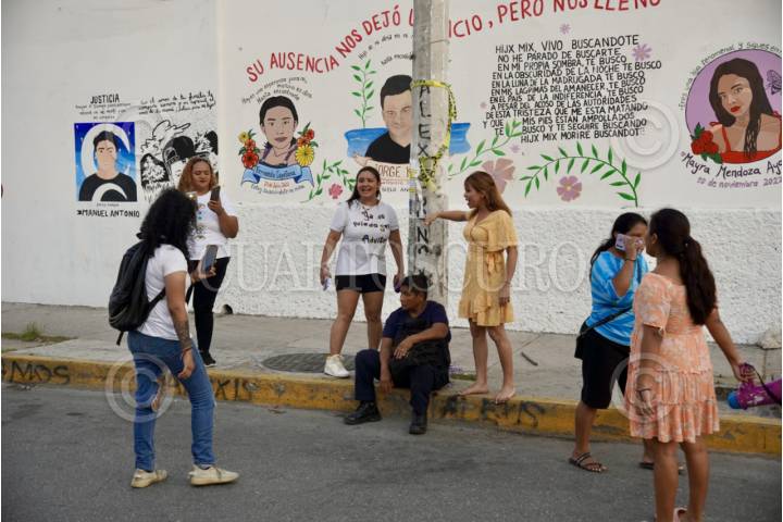 CANCÚN, QUINTANA ROO, 10MAYO2024.- Madres buscadoras detuvieron y amarraron a una oficial luego de que violara una valla donde ellas se encontraban realizando un mural en la Fiscalía General de Estado de Quintana Roo, sobre la avenida Xcaret con esquina avenida Kabah; las mujeres comentaron que la policía fue grosera e irrespetuosa. FOTO: ELIZABETH RUÍZ/CUARTOSCURO.COM