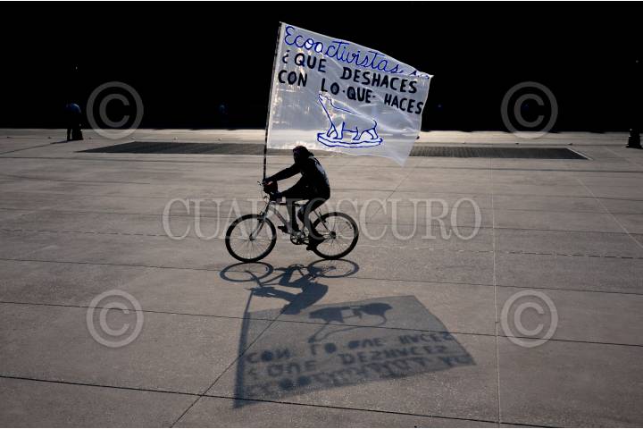 Un ciclista pasa sobre la explanada del Zócalo capitalino con una manta de protesta en referencia al Día de la Tierra.
