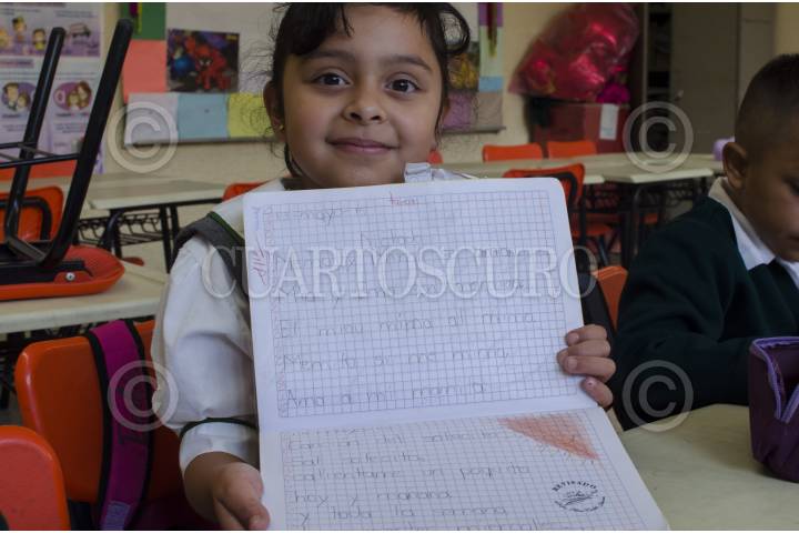 MÉXICO, D.F., 14MAYO2015.- Con un sello de "Revisado" la maestra motiva a los niños a que continúen con sus tareas. Una alumna muestra orgullosa su cuaderno después de realizar un ejercicio de "lectoescritura". Mañana se conmemora en México el Día del Maestro. FOTO: MARÍA JOSÉ MARTÍNEZ /CUARTOSCURO.COM