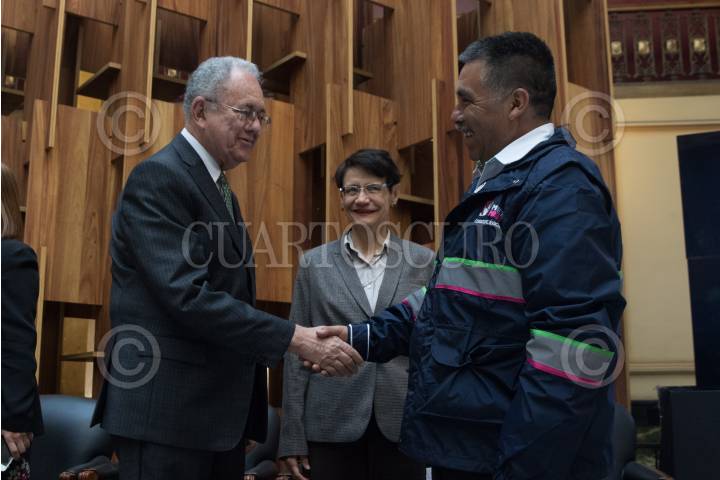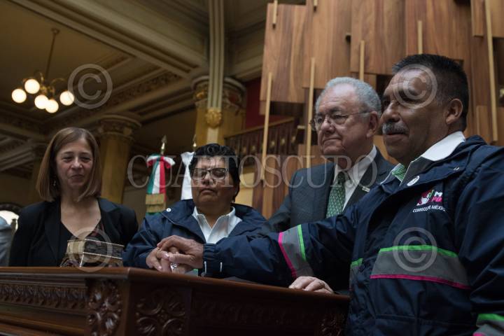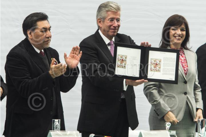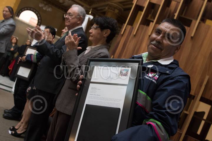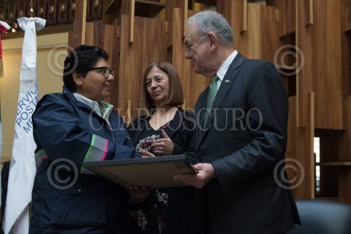 CIUDAD DE MÉXICO, 12NOVIEMBRE2019.- Javier Jiménez Espriú, secretario de Comunicaciones y Transportes, encabezó al celebración del Día del Cartero y Empleado Postal, en el Palacio Postal, en donde se reconoció por 30 y 35 años trabajando en el Servicio PosTal Mexicano a Celia Ramírez y Primitivo García Parra, respectivamente. Lo acompañaron Salma Jalife, subsecretaria de Comunicaciones y Desarrollo Tecnológico de la Secretaría de Comunicaciones y Transportes (SCT), y María Emilia Alejandra Janetti Díaz, directora del Servicio Postal Mexicano. FOTO: MOISÉS PABLO /CUARTOSCURO.COM