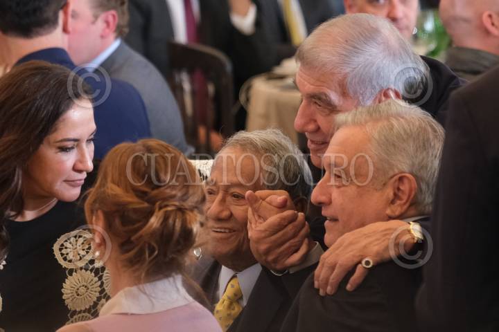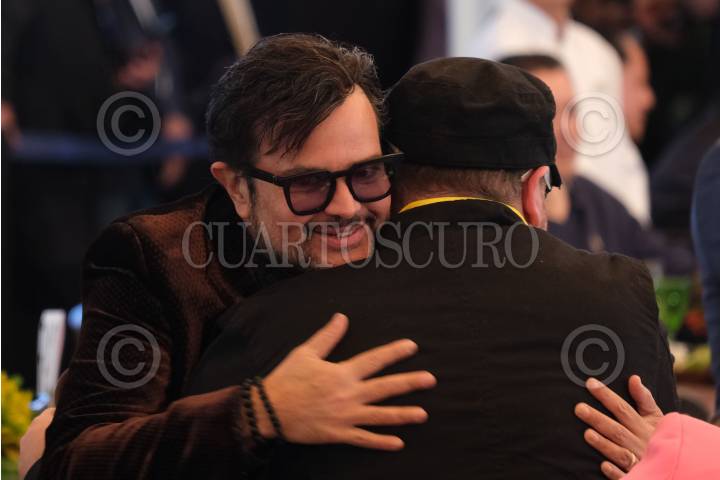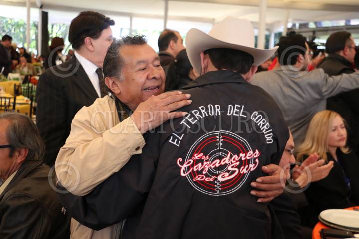 El senador Ricardo Monreal saluda a César Costa durante la comida por el Día del compositor celebrado en las instalaciones de la Sociedad de Autores y Compositores de México (Sacm).