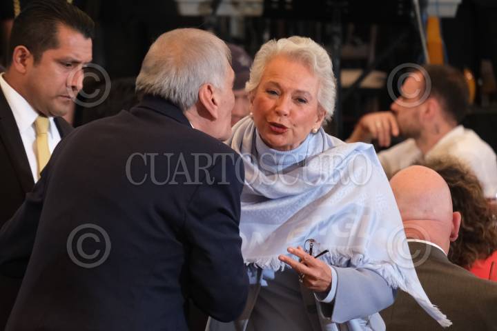 El compositor Martín Urieta y Olga Sánchez Cordero, secretaria de Gobernación, durante su llegada a la celebración del Día del Compositor.