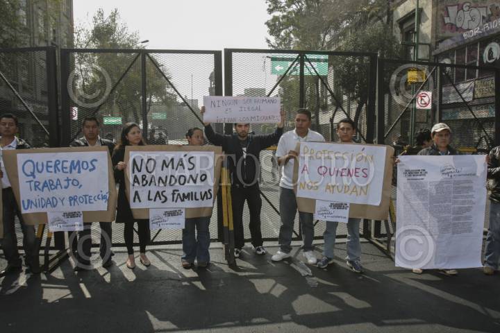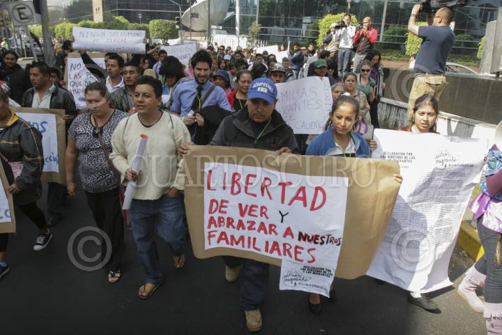 MÉXICO, D.F., 18DICIEMBRE2012.- Diversas organizaciones por los derechos de los migrantes se reunieron en el Centro Pro de Derechos Humanos, signaron una declaración con siete exigencias, llevadas en una caminata hacia la Secretaría de Gobernación "Alto inmediato a las políticas de criminalización y detención hacia las personas migrantes, desvincular el fenómeno migratorio de la Estrategia de Seguridad Nacional, no a la criminalización de la asistencia humanitaria. Libre tránsito a personas migrantes y eliminación de visas, que el Gobierno mexicano exija una reforma migratoria inmediata, respeto y garantías a la labor de migrantes y políticas públicas participativas", fueron las demandas. FOTO: JUAN PABLO ZAMORA /CUARTOSCURO.COM