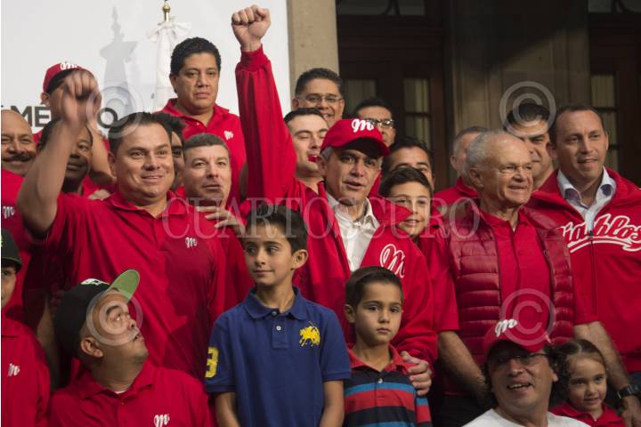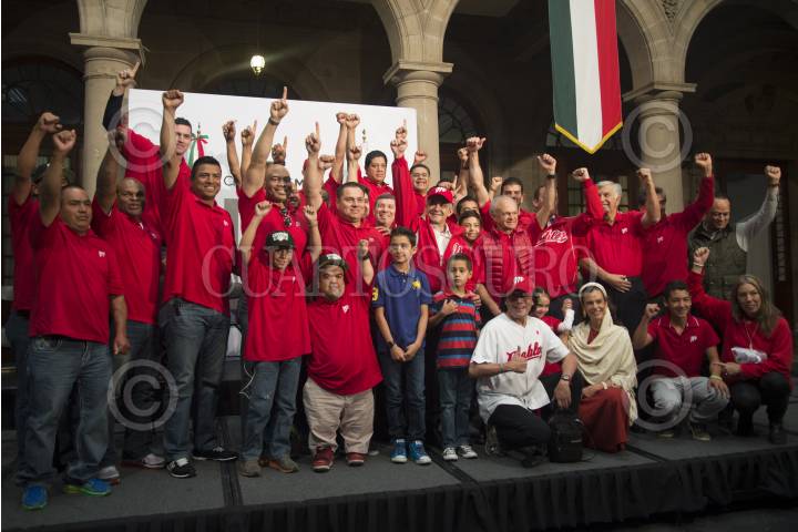 MÉXICO, D.F., 13SEPTIEMBRE2014.- El jefe de gobierno de la Ciudad de México Miguel Ángel Mancera recibió y felicitó a los integrantes del equipo de béisbol de la ciudad de México Los Diablos Rojos del México por su campeonato en la liga de béisbol mexicana. FOTO: ISABEL MATEOS /CUARTOSCURO.COM