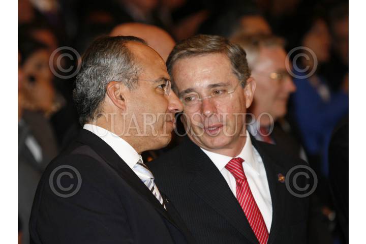 GUATEMALA, GUATEMALA, 14ENERO2008.- El presidente de México, Felipe Calderón, dialoga con el presidente de Colombia Álvaro Uribe durante la toma de posición del presidente electo de Guatemala Álvaro Colom Caballeros, FOTO: ALFREDO GUERRERO/CUARTOSCURO.COM