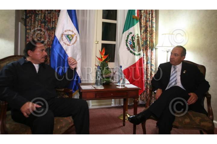 GUATEMALA, GUATEMALA, 14ENERO2008.- El presidente de México, Felipe Calderón, dialoga con el presidente de Nicaragua, Daniel Ortega previó a la la toma de posición del presidente electo de Guatemala Álvaro Colom Caballeros, FOTO: ALFREDO GUERRERO/CUARTOSCURO.COM