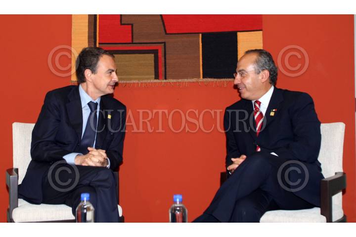 LIMA, PERU 16MAYO2008.-El presidente, Felipe Calderón dialoga con José Luis Rodríguez Zapatero, presidente del gobierno de España durante la reunión privada dentro del marco de la "V Cumbre de Jefes de Estado y de Gobierno" que tuvo lugar en el Museo de la Nación. FOTO: ALFREDO GUERRERO/CUARTOSCURO.COM