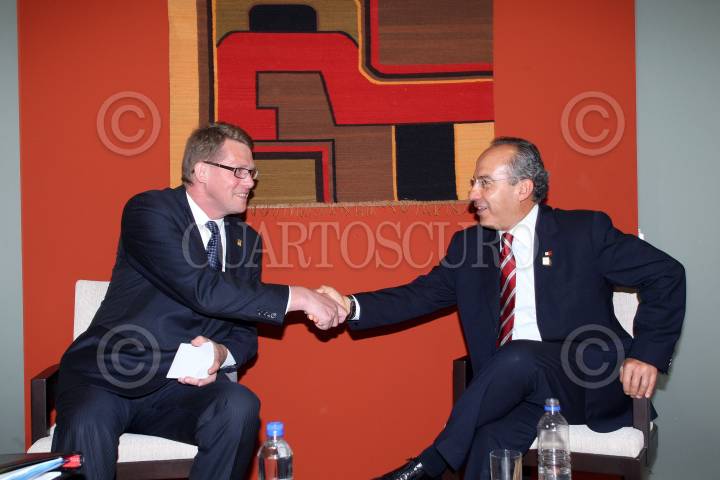 LIMA, PERU 16MAYO2008.-El presidente, Felipe Calderón dialoga con Matti Vanhanen, primer ministro de Finlandia durante la reunión privada dentro del marco de la "V Cumbre de Jefes de Estado y de Gobierno" que tuvo lugar en el Museo de la Nación. FOTO: ALFREDO GUERRERO/CUARTOSCURO.COM
