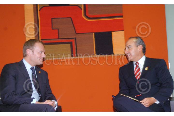 LIMA, PERU 16MAYO2008.-El presidente, Felipe Calderón dialoga con el primer ministro de la Republica de Polonia Donald Tusk, en el marco de la V Cumbre de Jefes de Estado y de Gobierno" que tuvo lugar en el Museo de la Nación. FOTO: ALFREDO GUERRERO/CUARTOSCURO.COM