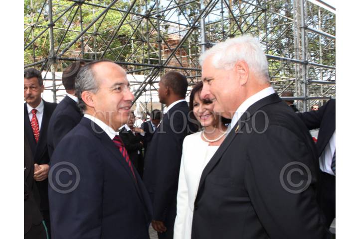 SAN JOSE, COSTA RICA, 08MAYO2010.- El presidente Felipe Calderón dialoga con el presidente de Panama Ricardo Martinelli durante la ceremonia de transmisión del mando presidencial de la república de Costa Rica que se realizo en el parque metropolitano "La Sabana". FOTO: ARIEL GUTIERREZ/CUARTOSCURO.COM
