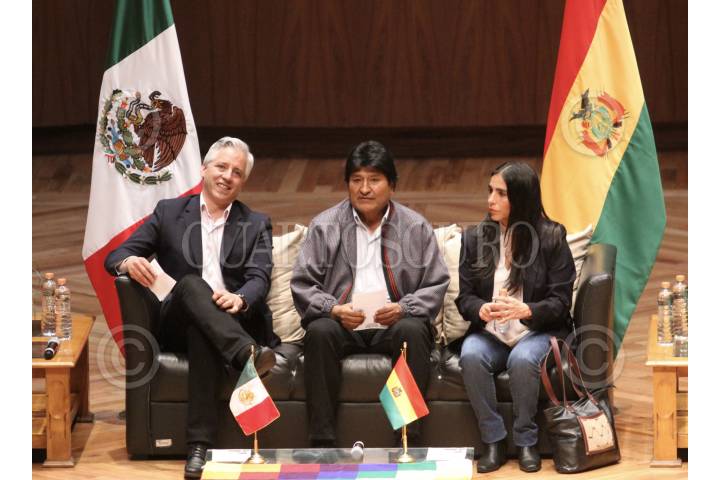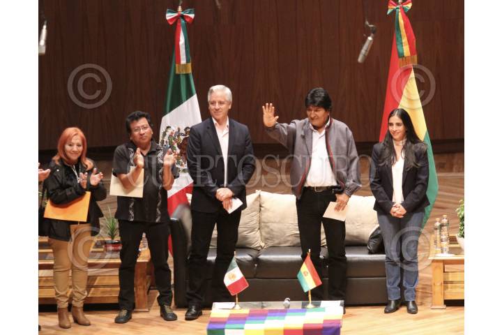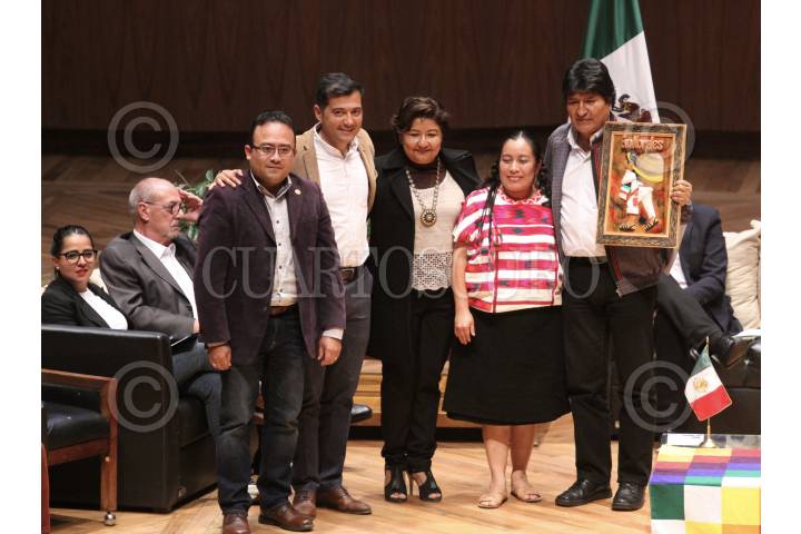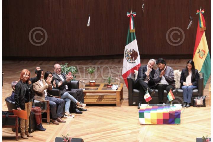 CIUDAD DE MÉXICO, 26NOVIEMBRE.- Evo Morales, expresidente de Bolivia, durante el conversatorio con alumnos de distintas universidades, realizado en la Sala Ollin Yoliztli, al sur de la ciudad. En imagen Evo Morales recibió un presente por parte de artistas y legisladores del estado de Oaxaca. FOTO: ROGELIO MORALES /CUARTOSCURO.COM