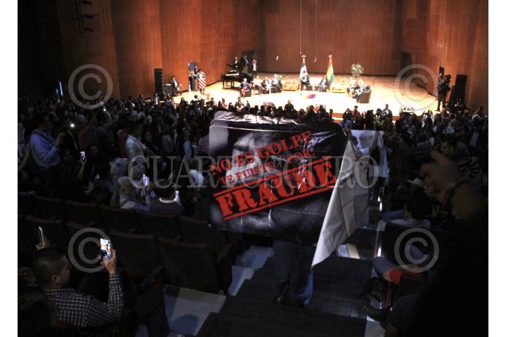 CIUDAD DE MÉXICO, 26NOVIEMBRE.- Evo Morales, expresidente de Bolivia, durante el conversatorio con alumnos de distintas universidades, realizado en la Sala Ollin Yoliztli, al sur de la ciudad. En imagen un grupo de opositores a Evo se manifestaron durante el inicio de su discurso. FOTO: ROGELIO MORALES /CUARTOSCURO.COM