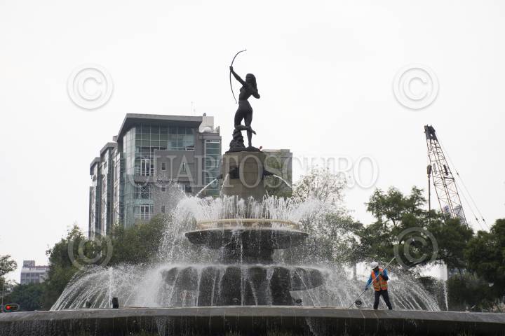 CIUDAD DE MÉXICO, 08MAYO2017.- Un trabajador realiza mantenimiento y limpieza en una de las fuentes más emblemáticas que se encuentran en la Ciudad de México, la Diana Cazadora. FOTO: MARIO JASSO /CUARTOSCURO.COM