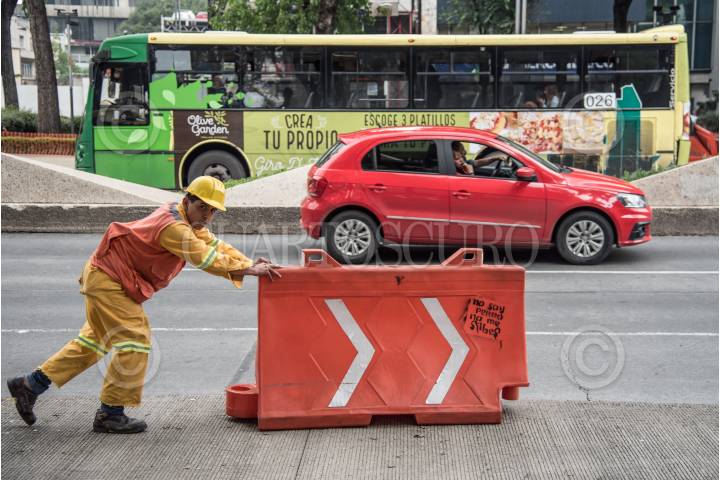 CIUDAD DE MÉXICO, 11JULIO2017.- En el tramo de avenida Paseo de la Reforma a la altura de la Diana Cazadora, iniciaron las obras para correspondientes a la construcción de la línea 7 del metrobús. En la imagen un trabajor acomoda un señalamiento de obras. FOTO: MARIO JASSO /CUARTOSCURO.COM