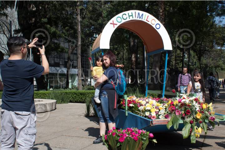 CIUDAD DE MÉXICO, 30NOVIEMBRE2019.- Una familia se toma una fotografía en una trajinera llena de flores, la cual forma parte del Festival de las Flores de Invierno, inaugurado esta mañana sobre avenida Paseo de la Reforma, entre la glorieta de la Diana Cazadora y la glorieta del Ángel de la Independencia. FOTO: MAGDALENA MONTIEL /CUARTOSCURO.COM