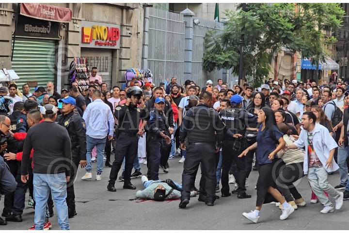 CIUDAD DE MÉXICO, 17OCTUBRE2024.- Fueron baleados Diana Sánchez Barrios y su novio en la calle de Motolinia. La líder de comerciantes resultó herida. El responsable fue un sujeto con gorra que tras agredirlos a balazos corrió hacia 5 de Mayo en donde ya lo esperaba un cómplice para huir en motocicleta. Se reportan como delicados las víctimas. El sitio fue acordonado por policías de la SSC. FOTO: CUARTOSCURO.COM
