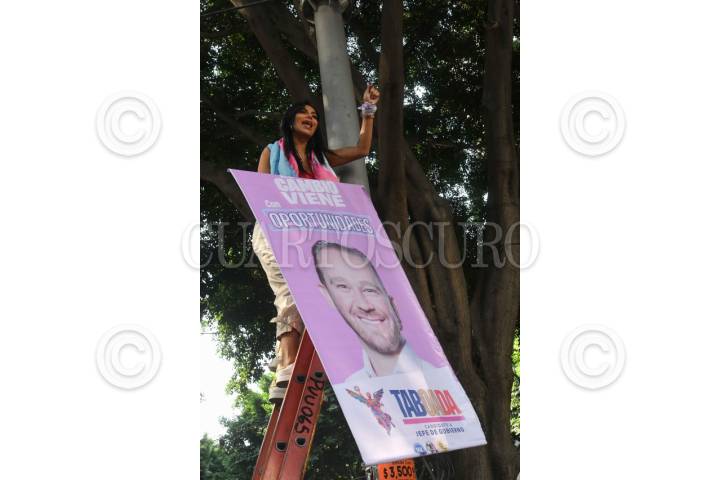 CIUDAD DE MÉXICO, 30ABRIL2024.- Diana Sánchez Barrios, activista y líder de comerciantes, junto a personas de la comunidad LGBTIQ+, y simpatizantes de Santiago Taboada, candidato a la jefatura de Gobierno por la coalición "Va por la CDMX" (PAN, PRI y PRD) encabezó una jornada de colocación de pendones sobre la calle de Génova a favor del candidato. FOTO: MARIO JASSO/CUARTOSCURO.COM