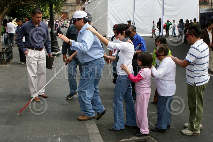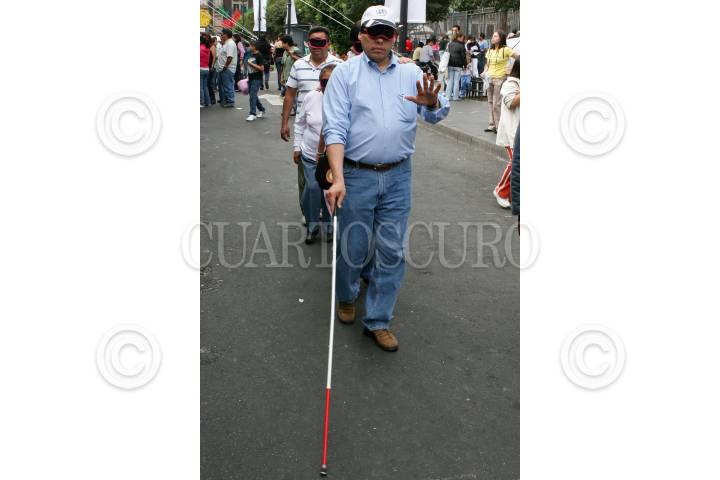 MÉXICO D.F., 06DICIEMBRE2009.- Luis Gonzalez Plascencia, presidente de la Comisión de Derechos Humanos camina con un grupo de personas cubiertas de los ojos durante una demostración para conocer más sobre como viven diariamente en la ciudad los invidentes durante la Octava Feria de los Derechos Humanos que se realiza a un costado del Zócalo y en donde tambien se realizan diversas actividades para para niños, jóvenes y adultos. FOTO: RODOLFO ANGULO/CUARTOSCURO.COM