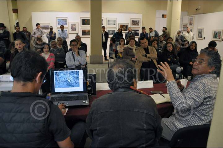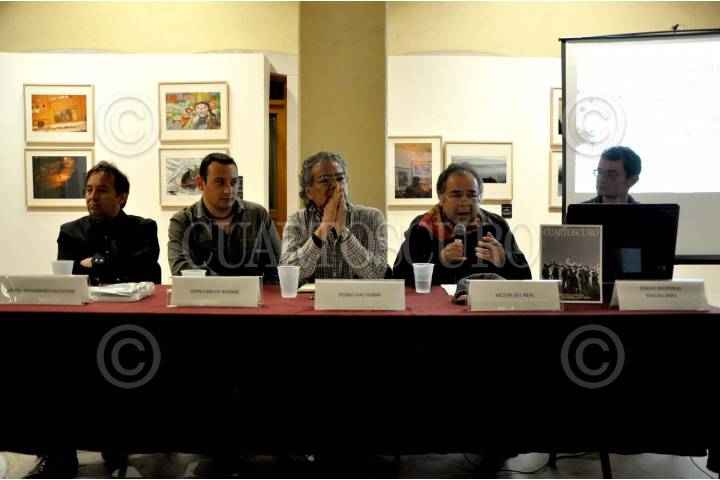 ZACATECAS, ZACATECAS, 16MARZO2018.- Ayer en la fototeca de Zacatecas se presento la edición 148 de la revista Cuartoscuro, misma que está dedicada al trabajo del fotoperiodista zacatecano Pedro Valtierra, del periodo de guerrilla en Guatemala en la década de los años ochenta, en los que documento también los movimientos armados de Nicaragua y El Salvador. En la tertulia fotográfica participaron el docente de la Unidad Académica de Antropología, Daniel Hernandez Palestino de la Universidad Autónoma de Zacatecas (UAZ), así como, el escritor Víctor del Real y el historiador Juan Carlos Basabe. FOTO: CARLOS SEGURA /CUARTOSCURO.COM